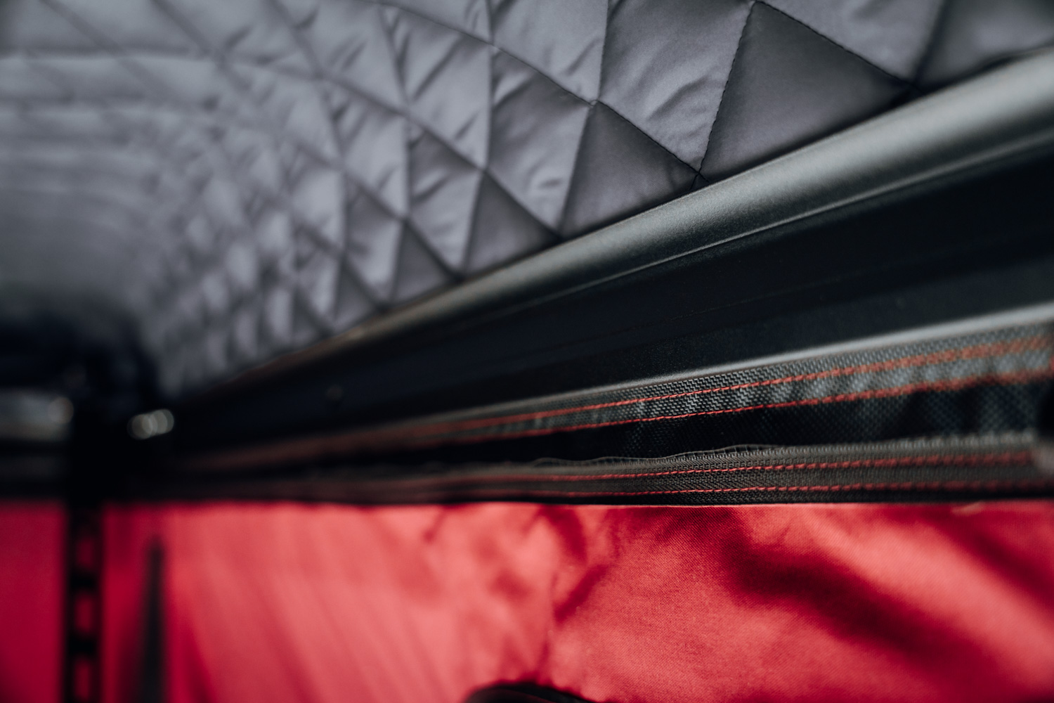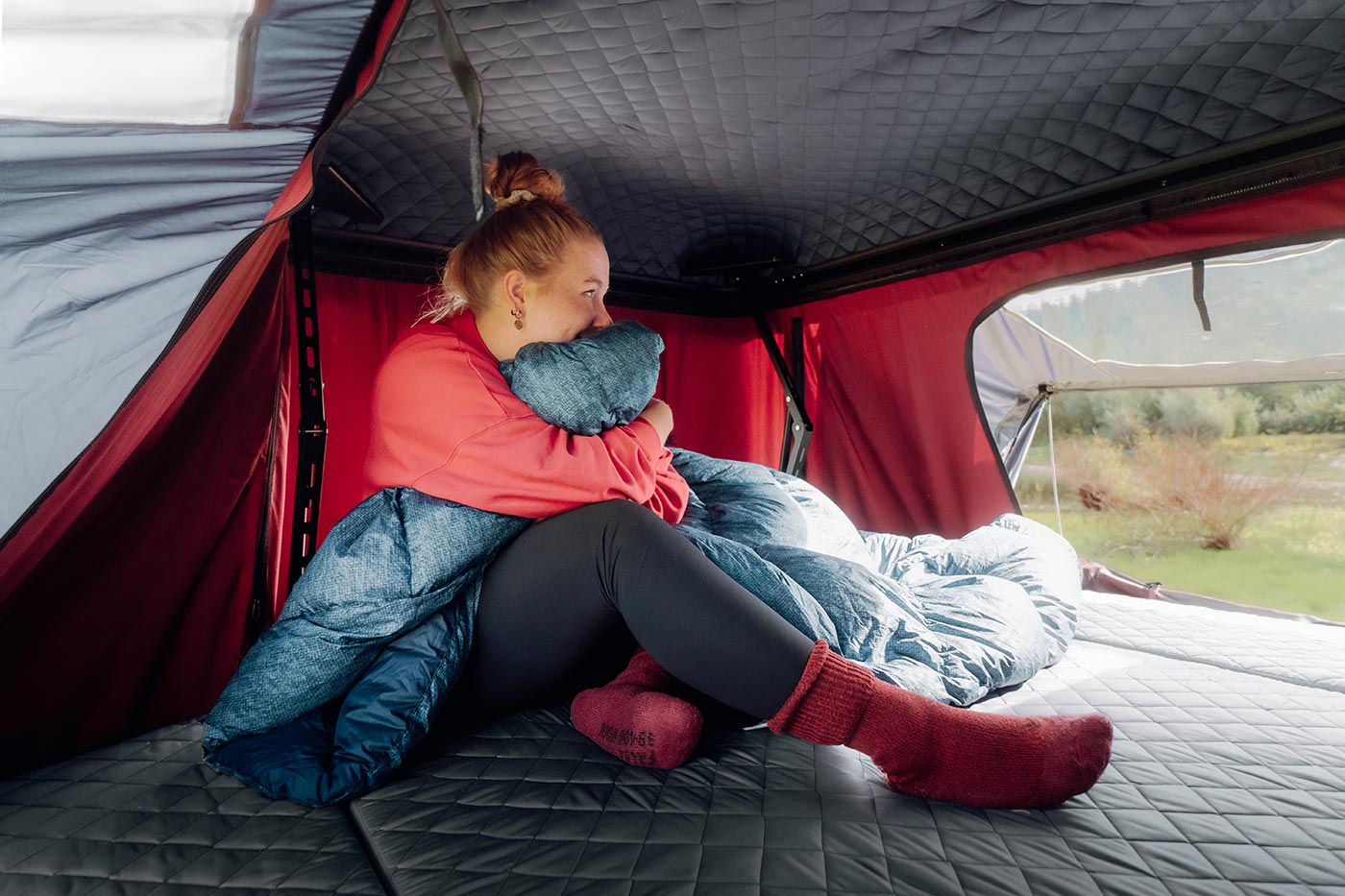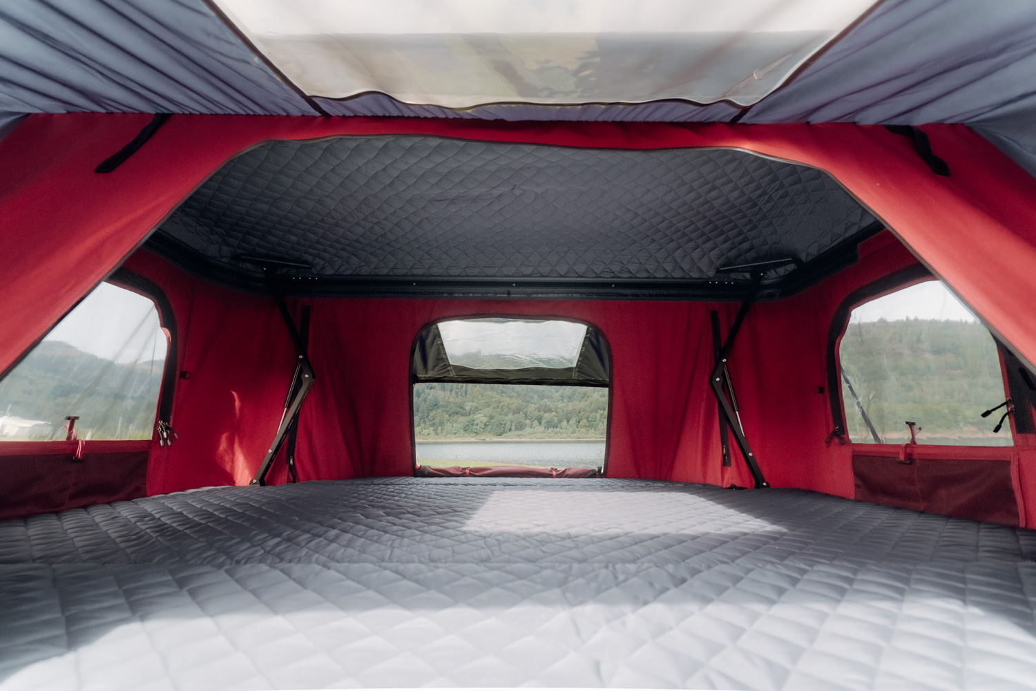 The special design of the ABS hard shell of the TedPop roof tent not only noticeably reduces air resistance while driving, but also brings other advantages. Unlike conventional hybrid roof tents, a fixed roof reliably protects the sleeping area. An additional internal quilted coating further improves functionality: It gives the hard shell special robustness and durability and at the same time has an insulating effect. This keeps the inside of the tent better protected from cold and outside noise – for a restful sleep in any weather.