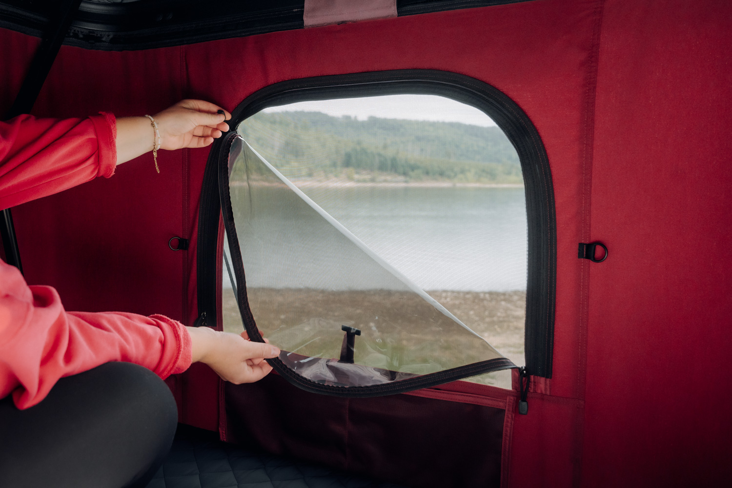 With the TedPop roof tent you can enjoy an extraordinary view – high up and perfectly framed by generous window areas. Each individual window has a close-meshed, durable mosquito net that reliably protects you from annoying pests. Internal weather protection covers ensure that you are well protected even in rain and wind. The cleverly designed window canopy even allows fresh air to circulate in heavy rainfall without moisture penetrating.