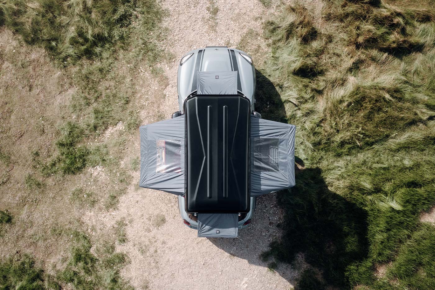 The TEDPoP hard shell roof tent unfolds in seconds into a comfortable living space for up to four people. Thanks to the room extensions that can be folded out on two sides, it offers a generous lying surface and 360° panoramic view. The robust hard shell ensures quick setup and optimal weather protection. With access from both sides and sophisticated design, your vehicle becomes a mobile home in no time at all.